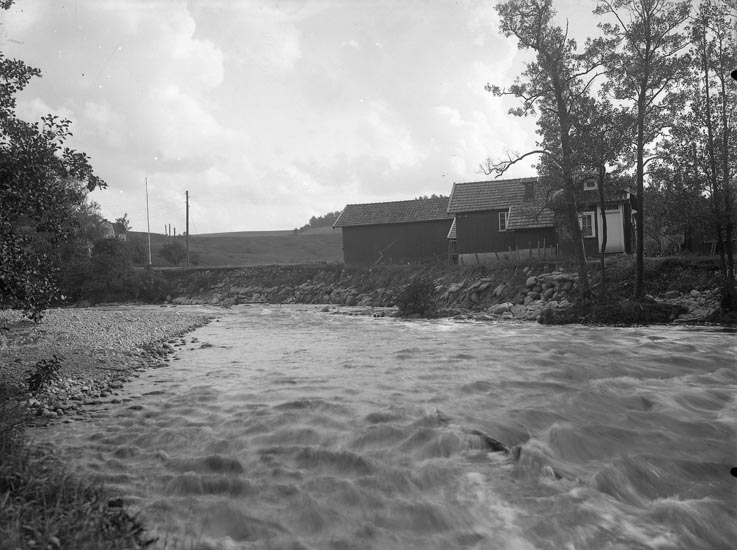 Text som medföljde bilden: "Hedeholm från bruksvägen taget över älven. Ladugården källarvinden och på gaveln drängstugan. Undertecknad uppvuxen på gården 1949-1973."