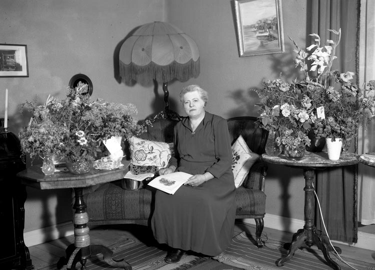 Text som medföljde bilden: "1955. No. Selma och Elin Sahlberg. Elin ensam med blomma på sin 70-årsdag. Selma 2 1/2 år äldre privat".