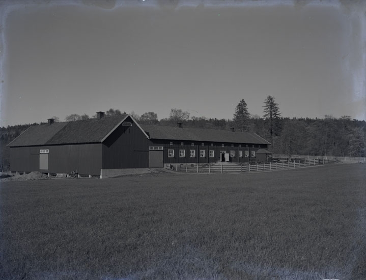 "Fotot taget från väster. Det mycket täta staketet till höger och bakom ladugården går utmed infartsvägen till gården. Bostadshuset finns bakom ladugården. Fähuset med alla fönster har höjts och är nu högre än delen till vänster."