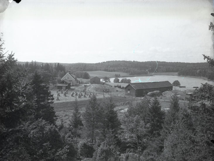 "Till vänster familjen Hanssons bostad och till höger deras ladugård. i mitten Pontus Wiknerstugan, numera museum. Sjön heter Kikerudssjön."