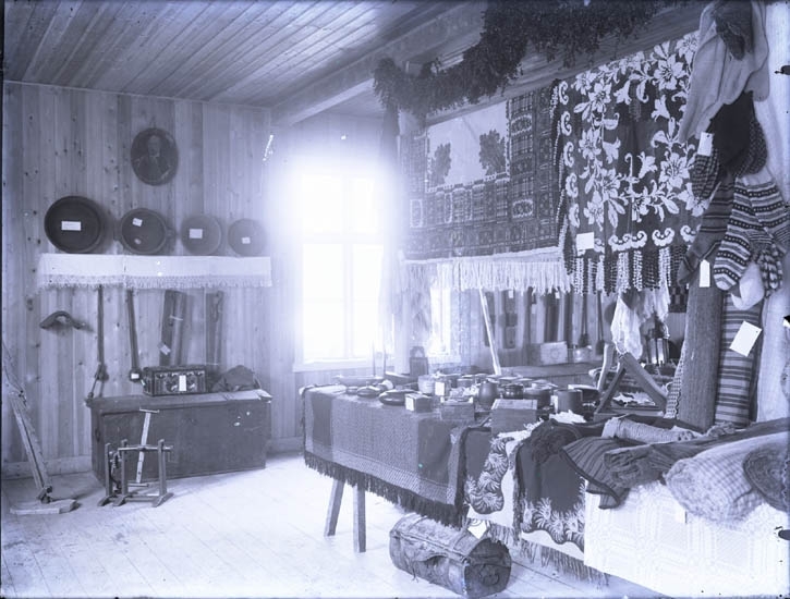 "Kleberg Utställning af gamla vävnader omkring år 1924 vid slöjdlokalen i Munkedal. Doktor Sundberg."