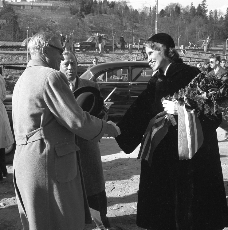 Dop och sjösättning av fartyget 132 M/T Thorsholm. Skeppsredaren och varvets grundare Gustaf B. Thordén hälsar på fartygets gudmor.