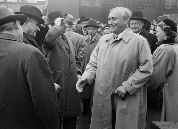 Från dop och sjösättning av fartyg 126 M/T Aslaug Torm. Mannen i ljus rock är redaren och Uddevallavarvets grundare Gustaf B. Thordén.