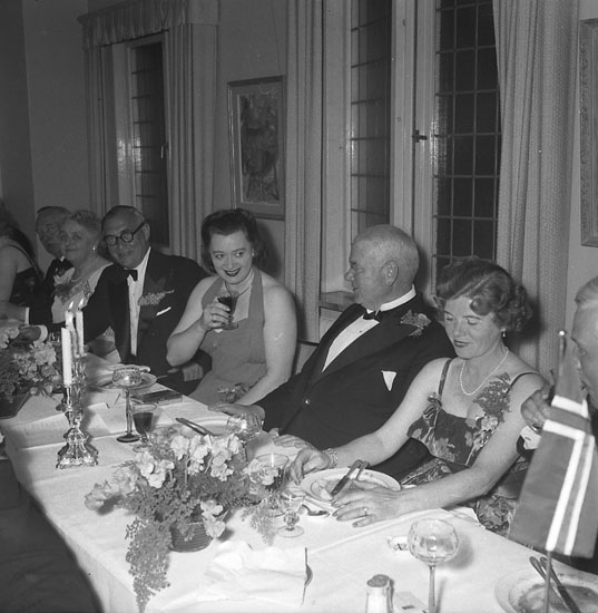 Sjösättningsmiddag för 124 M/T Astrid Elisabeth. Mannen med glasögon är redaren och Uddevallavarvets grundare Gustaf B. Thordén.