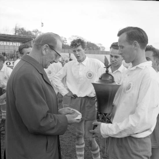 Fotbollsspelarna Hasse Samuelsson och Rolf Tärneberg från Kungshamns IF vid prisutdelning