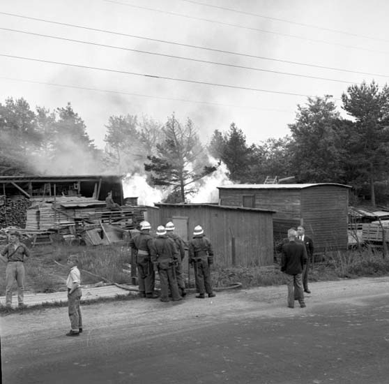 Brandmän bekämpar en eldsvåda i Dalaberg, i norra delen av Uddevalla, juni 1958