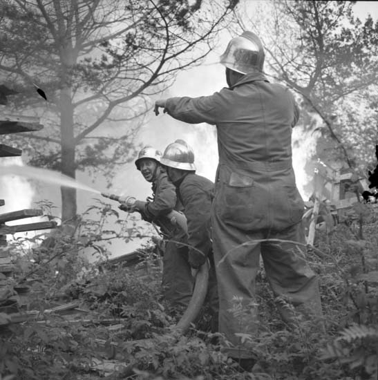 Brandmän bekämpar en eldsvåda i Dalaberg, i norra delen av Uddevalla, juni 1958