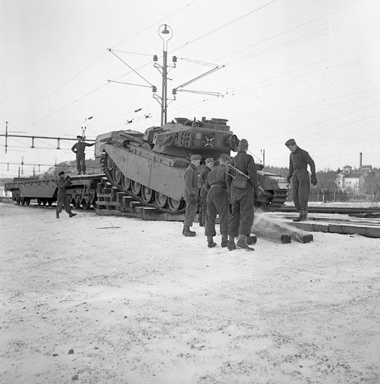 Enligt notering: "Stridsvagnar till U-a via Centralen. I 17, P 4 i Skövde 22-1-1956. Foto Knut".