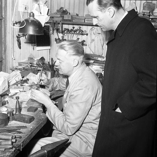 "Brudkrona hos Bokströms Juvelaffär. Pastor Malmgren och Bokström 4-1-1956. Foto Knut".