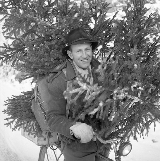 "Julmotiv. Cyklist med gran 23 december 1956" enligt notering.