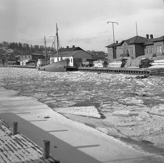 Enligt notering: "Vy över hamnen (packis) febr. 1956".