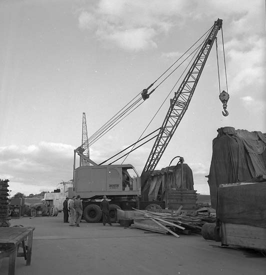 Mobilkran Västra kajen, Kasen. Från andra personen från vänster: förm. Rolf Wigerhed, ing. Kurt Thelliander och rep. Östen Johanson.