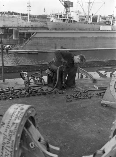 Nitning av växlar på huvuddäck. Nitare Stig Johansson.
