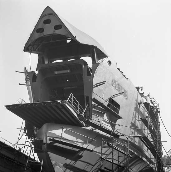 Färjan 264 M/F Scania på stapelbädden. Bogvisiret är öppet.
