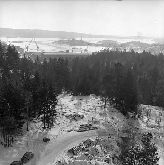 Bostadshus under uppförande. Sunnanvindsvägen 2, Skogslyckan. Fosfaten och Sörvik syns i bakgrunden.