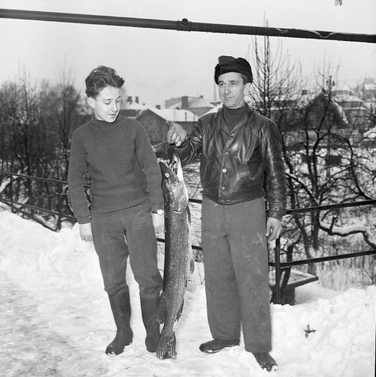 Algot Svanberg, Uddevalla, visar upp en stor gädda i januari 1955