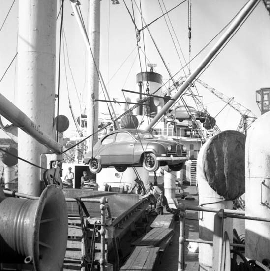 Lastning av Saab-bilar för export i Uddevalla hamn i maj 1959