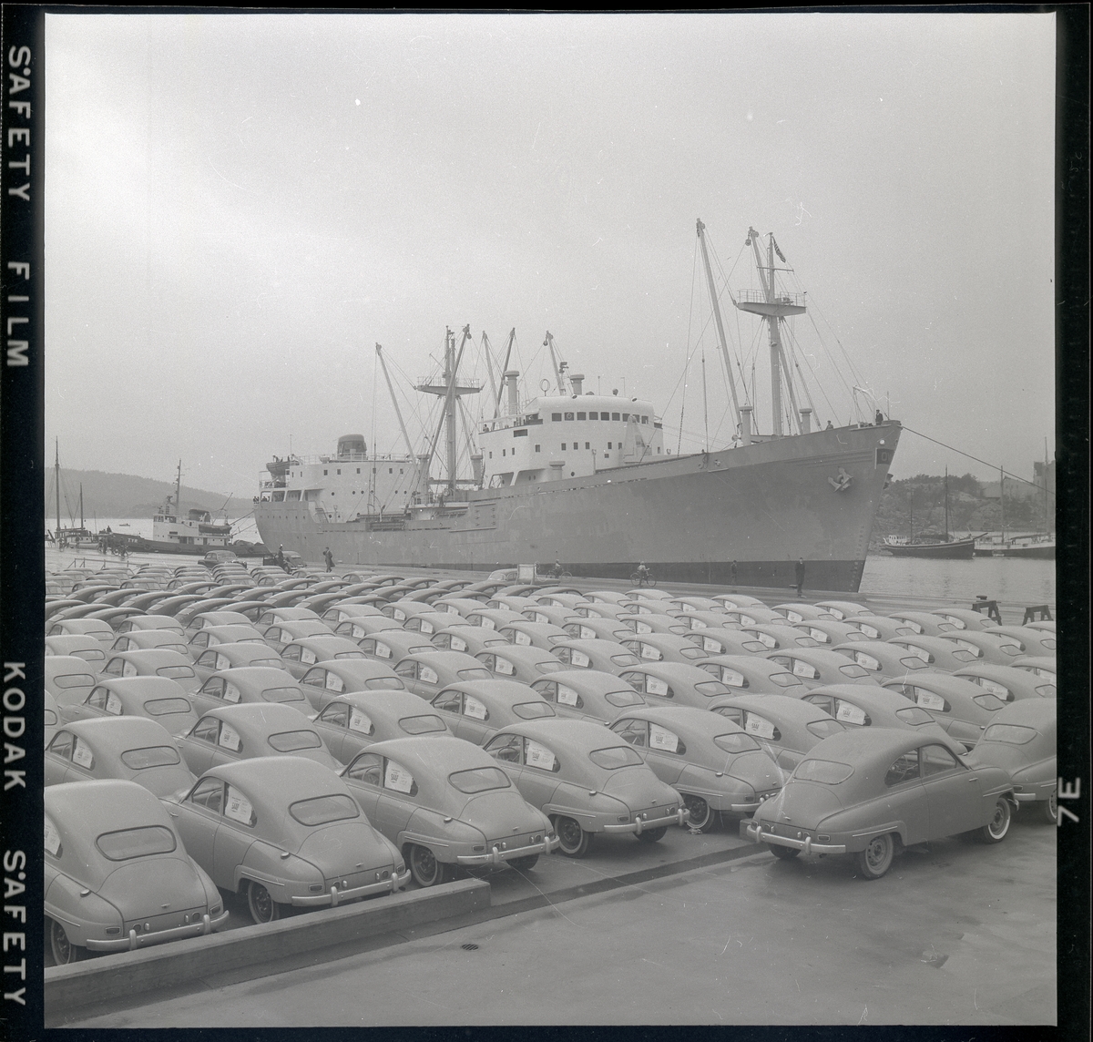 Bilar tillverkade på Saab-fabriken i Trollhättan i väntan på export till USA i Uddevalla hamn i juli 1957