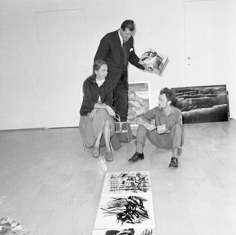 Hängning av utställning med verk av Kurt Dejmo på Nyttokonst i Uddevalla hösten 1960