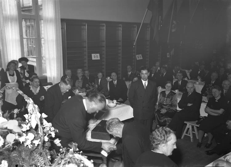 Text som medföljde bilden: "1946. Nr. 46. Från jubileumsfesten i Munkedals bruk. Skeppsredare Onstad delar ut gratifikationer".