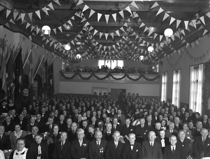 Text som medföljde bilden: "1946. No. 36. Munkedals arbetare ...? dubbel. Den äldsta gruppen pensionärer vid Smedjebruket."