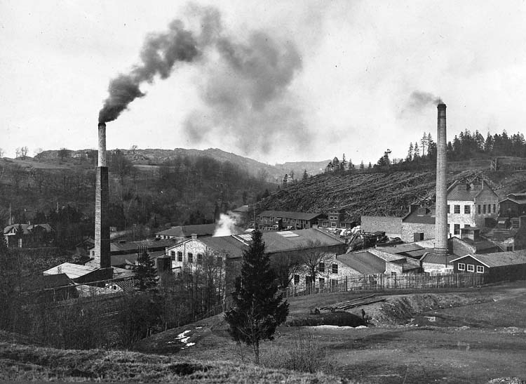 Enligt text på originalet: "Munkedals pappersbruk. Sulfitfabriken till höger. Efter sulfitfabrikens återuppbyggnad efter branden mars 1911. Ivar Lindeberg var ingenjör vid sulfitfabriken 1-4-1911-30-6-1913".