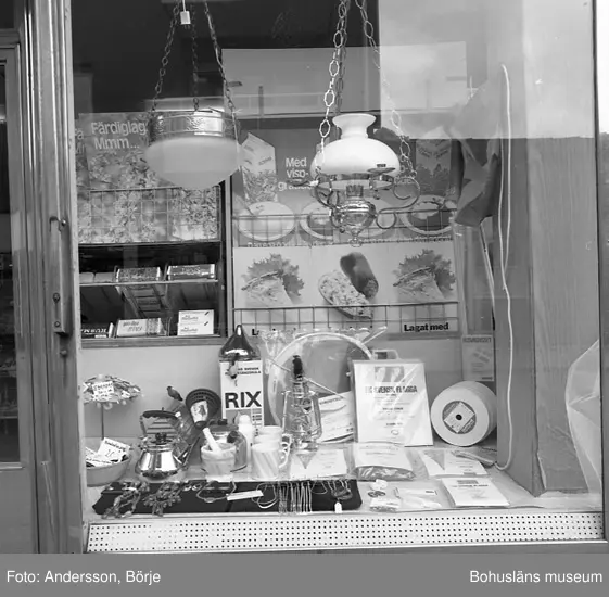 "Antonssons blandning" skyltning av diverse artiklar typ flaggstångskulor, rengöringsmedel, kaffekittel, i skyltfönster hos Edwin Andreassons"