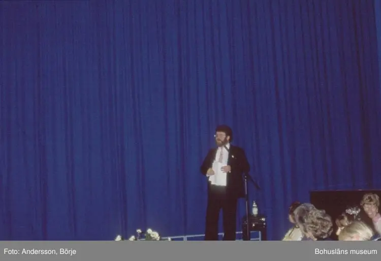 Stellan Granat, konferencier vid modevisning i hörsalen på Bohusläns museum, hälsar publiken välkommen