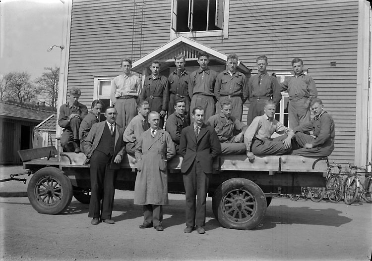 Enligt noteringar: "Grupp elever och lärare framför slöjdskolan. Stående fr.v. smideslärare Kjerrström, slöjdlärare Åke Karlsson, samt okänd." (BJ)
