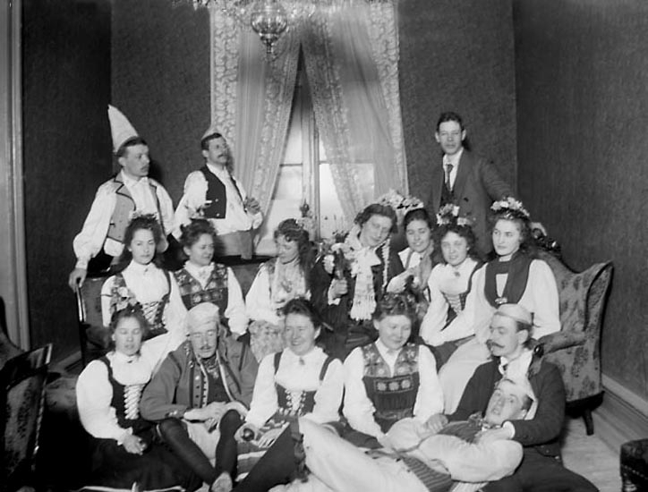Enligt fotografens noteringar: "Cottillondekorerade folkdansare."