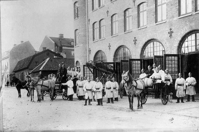 Enligt tidigare noteringar: "Avfotografering av foto av A. Hansson, 1905 föreställande Uddevalla brandkår framför gamla brandstationen vid Torggatan."