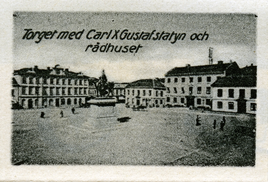 Text till bilden: "Torget med Carl X Gustaf statyn och Rådhuset".