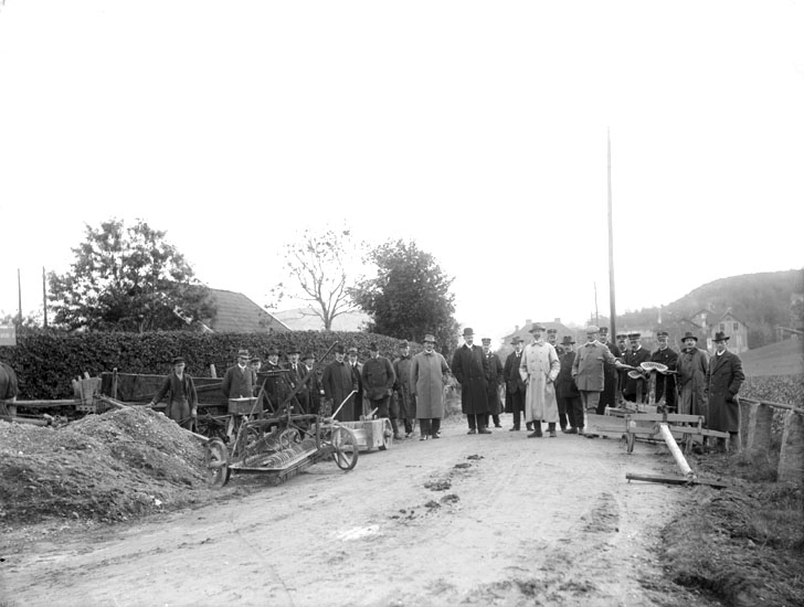 Enligt noteringar: "Vägbygge Stationsvägen. Husen i fonden är Munkedals järnvägsstation med tjänstebostad och till höger bebyggelse vid Jonsängen." (BJ)