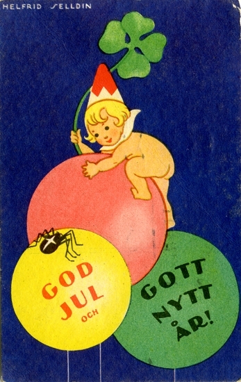 Kort: "God Jul och Gott Nytt År!". Barn som klättrar på ballonger.