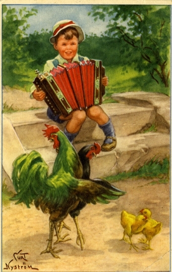 Titel: Kort: "Glad Påsk tillönskas". Pojke som sitter på en trappa och spelar dragspel.
