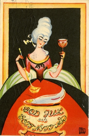 God Jul och Gott Nytt År. Dam klädd i 1700-talsmundering serverar något drickbart ur en rykande varm kittel.