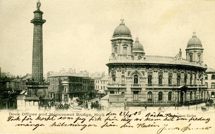 Notering på kortet: Dock Offices and Monument Bridge Hull.
