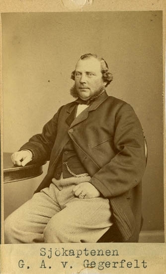 Text på kortets baksida: "Sjökaptenen Georg Adolph v Gegerfelt, f. 1826. Son af Major C.C. v. G. Carolina Fredrica Clancey. G. 1862 m. Anna Charlotta Mariana Aurora v. Gegerfelt, f.1834. Ångbåtsbefälhafare å Uddevalla, sedan Oscar II".