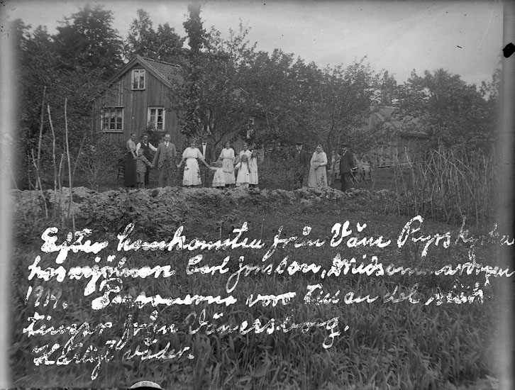 Enligt text på fotot: "Efter hemkomsten från Väne Ryrs kyrka hos mjölnaren Carl Jonsson, Midsommardagen 1919. Personerna var till en del släktingar från Vänersborg. Härligt väder".