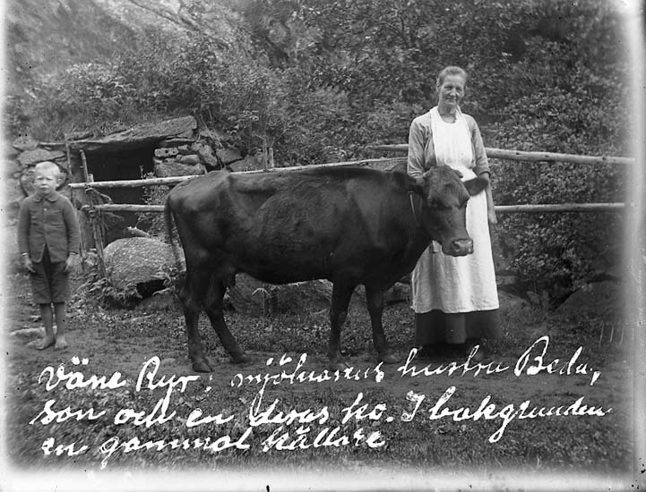 Enligt text på fotot: "Väne-Ryr: mjölnarens hustru Beda, son och en deras ko. I bakgrunden en gammal källare".