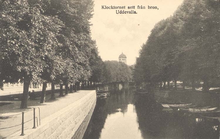 Tryckt text på kortet: "Klocktornet sett från bron, Uddevalla."