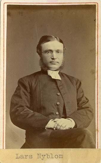 Text på kortets baksida: "Lars Nyblom, f. 1844. Kyrkoherde i Spekeröd 1881".