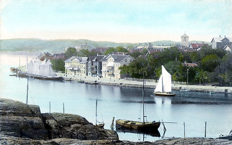 Tryckt text på baksidan: "Vy af Marstrand. Vilh. Eurenius Jor. Fotografi Atelier Drottninggatan 31 GÖTEBORG, försäljes av Otto Svensson Marstrand."