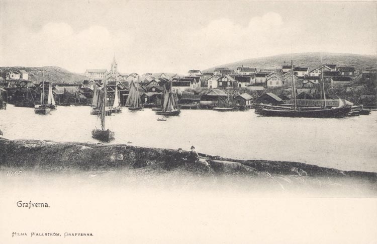 byggda skolhuset. Vid Fiskeskär Hilmer Johanssons tvåmastade skonare Svea.