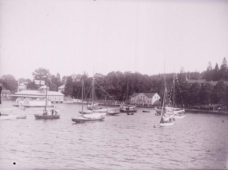 Enligt text som medföljde bilden: "Kappsegling. Hamnen med lustbåtar efter seglingen. Gustafsberg 30/7 1899.