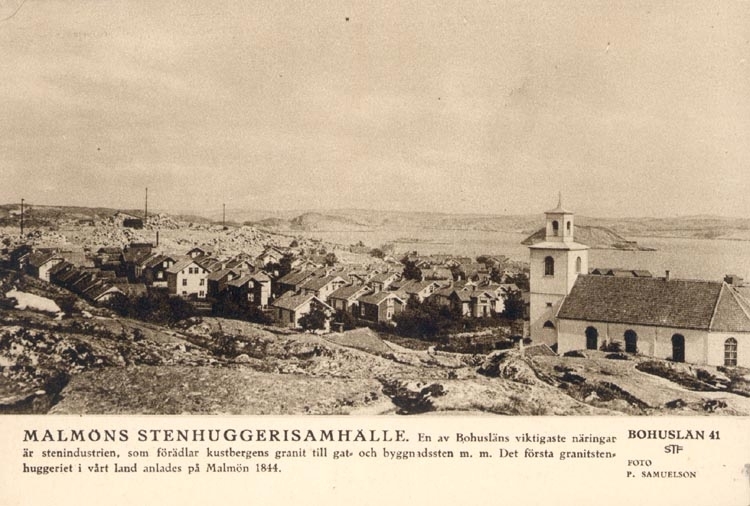 Tryckt text på kortet: "MALMÖNS STENHUGGERISAMHÄLLE. En av Bohusläns viktigaste näringar är stenindustrin som förädlar kustbergens granit till gat- och byggnadssten m. m. Det första granitstenhuggeriet i vårt land anlades på Malmön 1844".