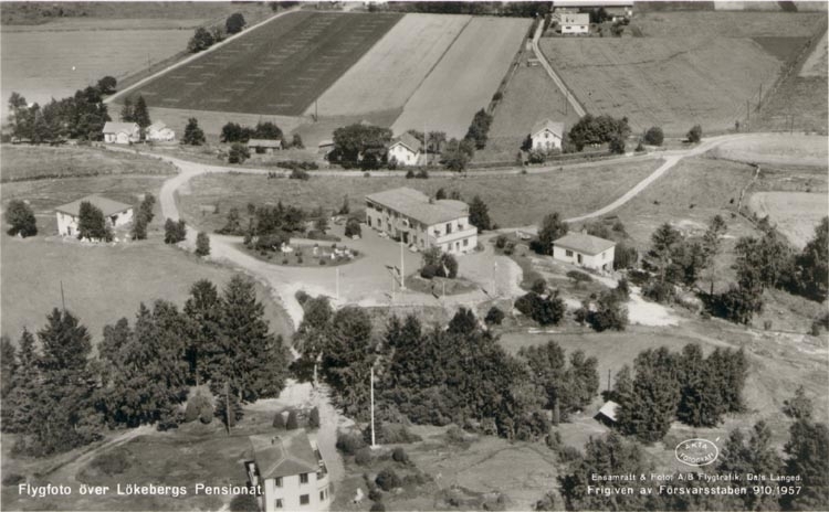 Tryckt text på kortet: "Flygfoto över Lökebergs Pensionat".