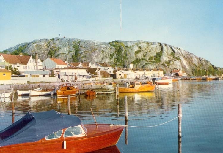 Tryckt text på kortet: "Grebbestad med Stöberget i bakgrunden."