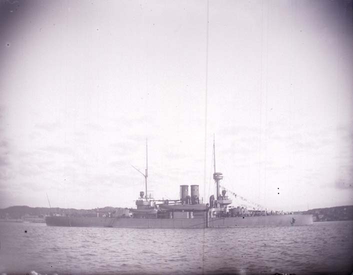 Enligt text som medföljde bilden: "Svenska Pansarbåten "Niord" från sidan. 24/8 1899