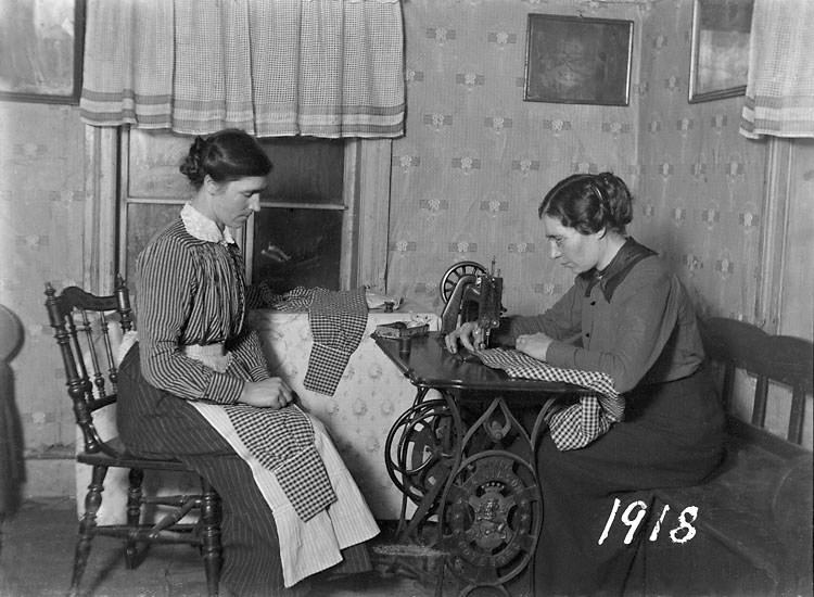 Enligt noteringar: "Vid symaskinen. Johan Johanssons hem. Systern Klara och